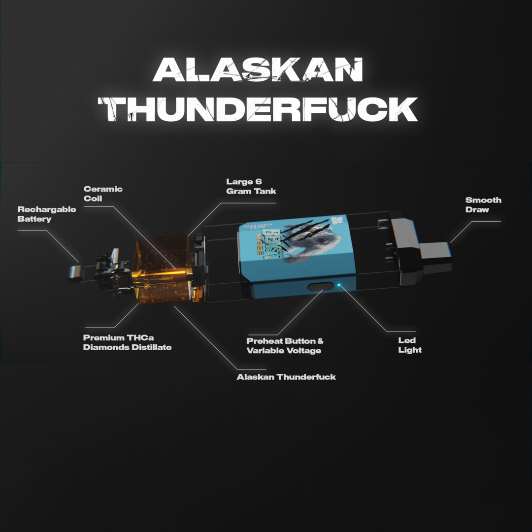 Ready to get higher than ever before? Introducing what might be the world’s largest and most powerful disposable vape. Introducing the Beast Mode Series, an extremely limited run, absolutely insane 6 gram device filled with everyones favorite THCa Diamonds. With 5 sought after strains to choose from and flavor profiles that are to die for. Coming in Alaskan Thunderf*ck (Sativa), Cereal Milk (Hybrid), Sour Apple Killer (Hybrid), Forbidden Fruit (Indica), and Grape Ape (Indica). This Vape is rechargeable, has anti clogging technology and most importantly will blow you away. No description can accurately do this justice, you just have to try it for yourself.