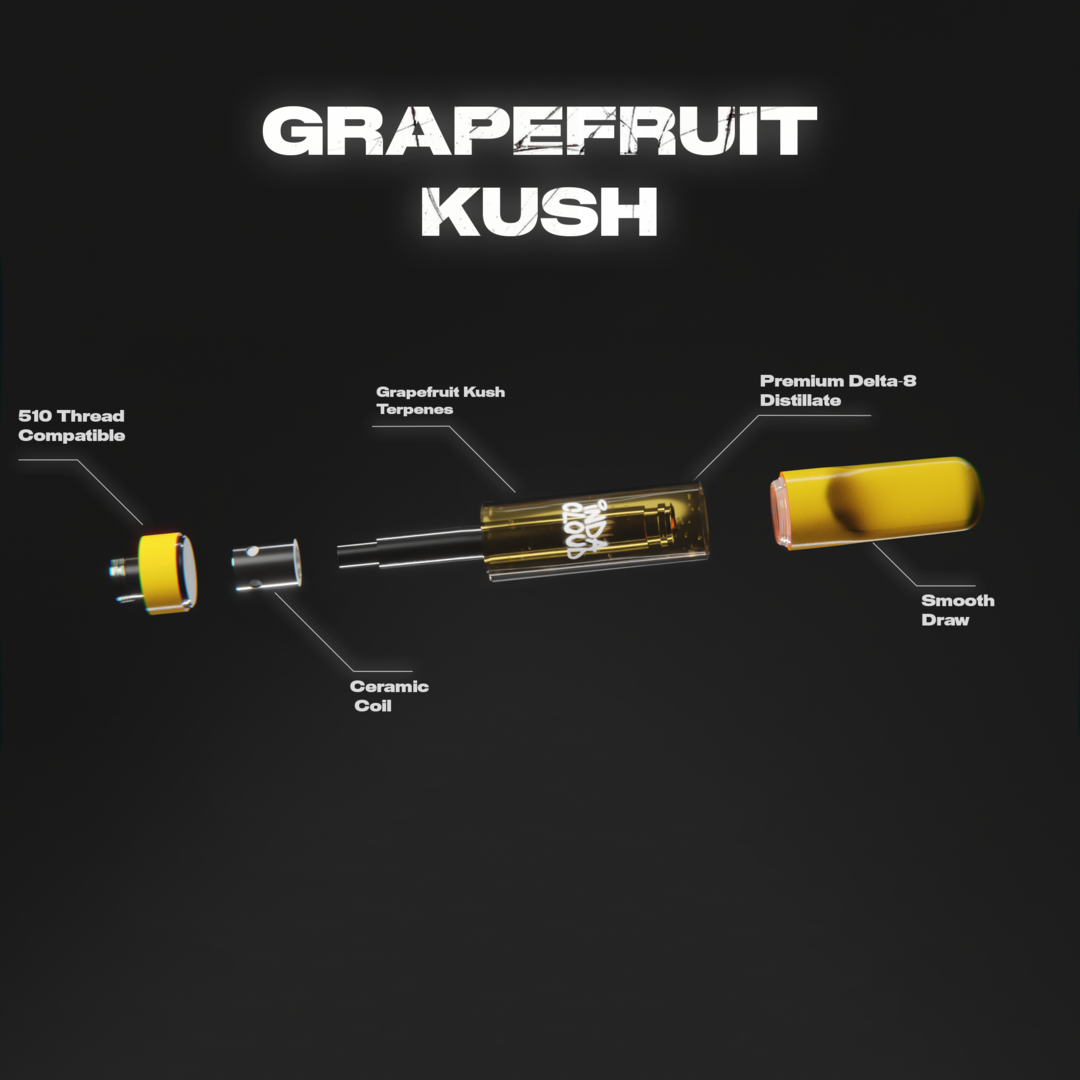 Each Grapefruit Kush Cartridge contains approximately 920 mg of Delta 8 THC, a substantial amount designed to provide you with a substantial vaping experience. The remaining volume comprises botanical terpenes that contribute to the unique flavor profile of the cartridge. The Delta 8 THC content has been carefully calculated to offer a balance of enjoyment and wellness benefits, all packaged in a compact, easy-to-use cartridge.