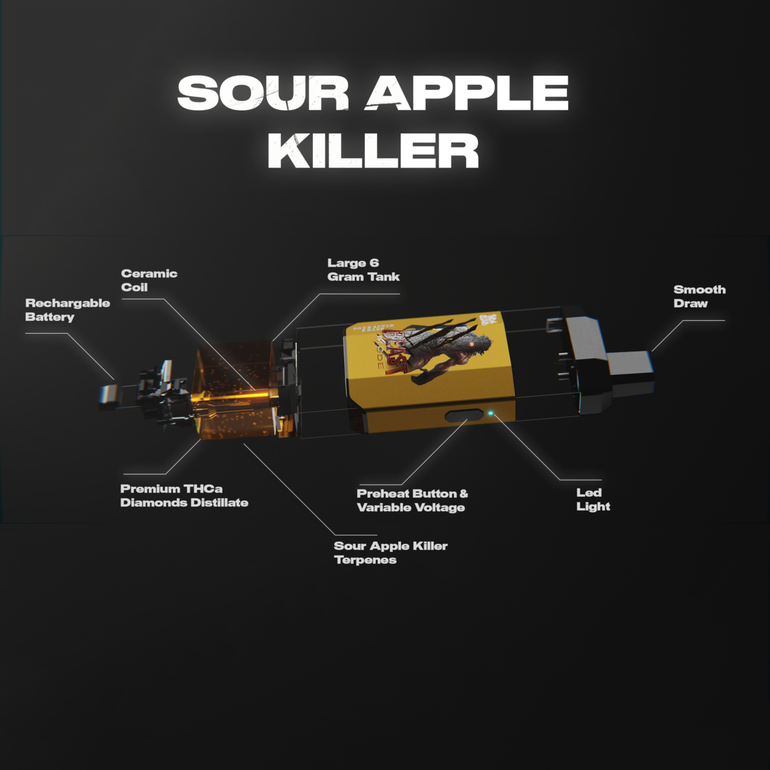 From the tales of ancient Greek myth and legend emerges the Sour Apple Killer. This 6 grams THCa Diamonds disposable vape echoes the conquest of the ancient cyclops. A truly mastered elixir blends an essence of sour apple and citrus, fit for the Gods of Olympus. Let this strain tantalize your taste buds while killing your nightmares as this indica vape is made for the deepest and sweetest of sleeps.