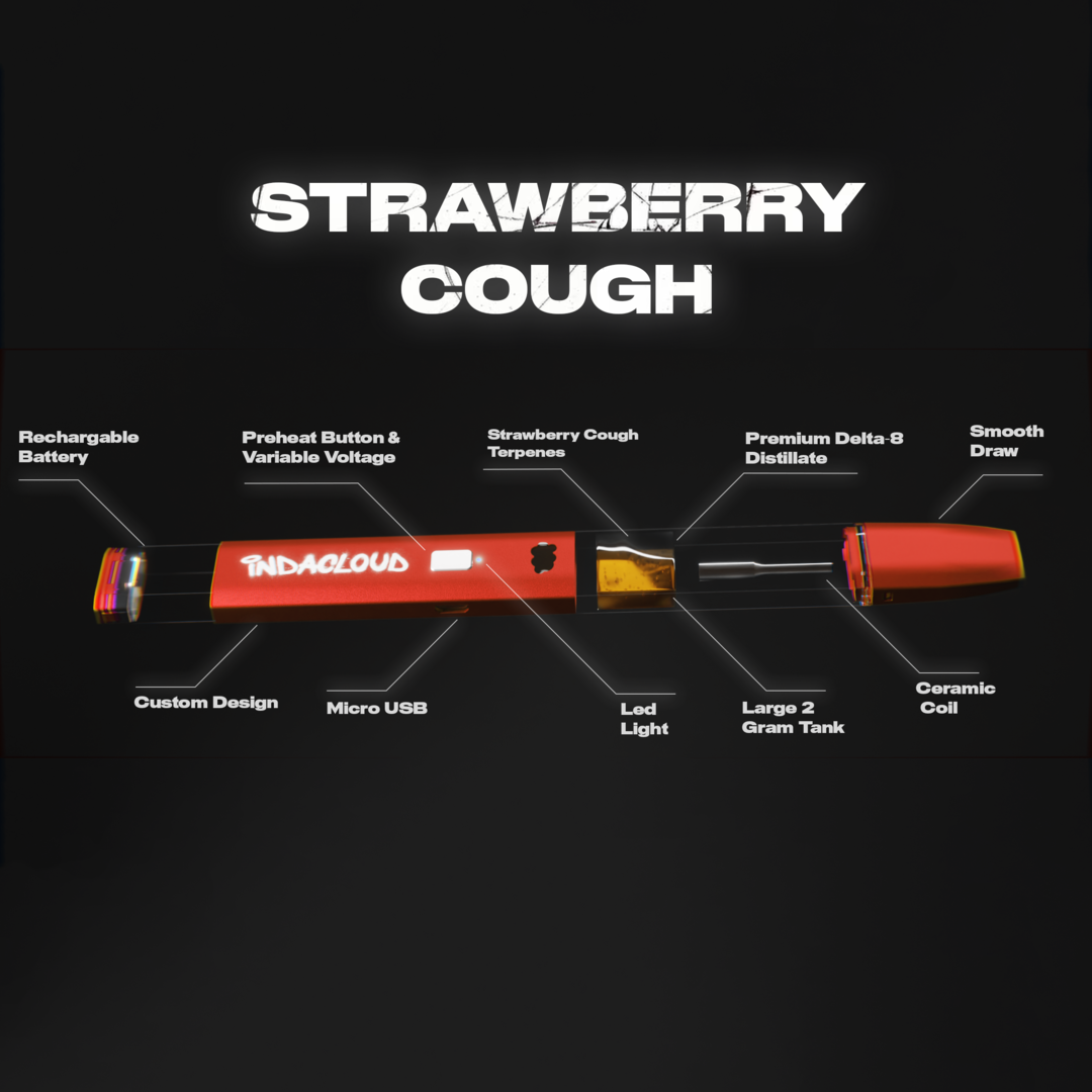 The Strawberry Cough Delta 8 Disposable Vape Pen sets itself apart from traditional Delta 8 THC cartridges in several ways. Firstly, it's a disposable device, meaning you don't need to worry about refills or recharging. Once you've enjoyed all it has to offer, you discard it. Each pen has its own ceramic coil and internal battery, ensuring a smooth draw and consistent performance. In contrast to some cartridges, our disposables are pre-filled with 2 grams of high-quality, hemp-derived D8 THC distillate, a generous amount designed to provide an extended vaping experience. Also, the Strawberry Cough flavor offers a unique sensory experience that sets it apart from other vape products.